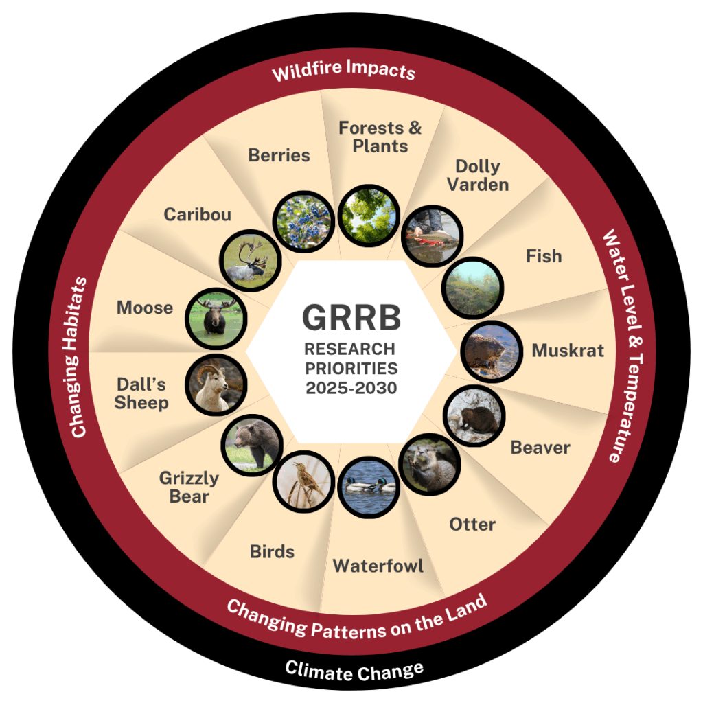 Every five years, the GRRB assesses the items in the Research and Management Interests list and assigns them priority scores. The items with the highest scores form the GRRB Research and Management Priorities for the next five-year period and will determine which research projects the GRRB will support and participate in. Research Priorities are listed in broad categories (e.g. Caribou), indicating that there is potential for a wide range of research and reflecting the breadth of interests that community members often expressed in these topics. The GRRB values research approaches that include traditional management and/or community-based science. GRRB Research and Management Priorities 2025-2030: